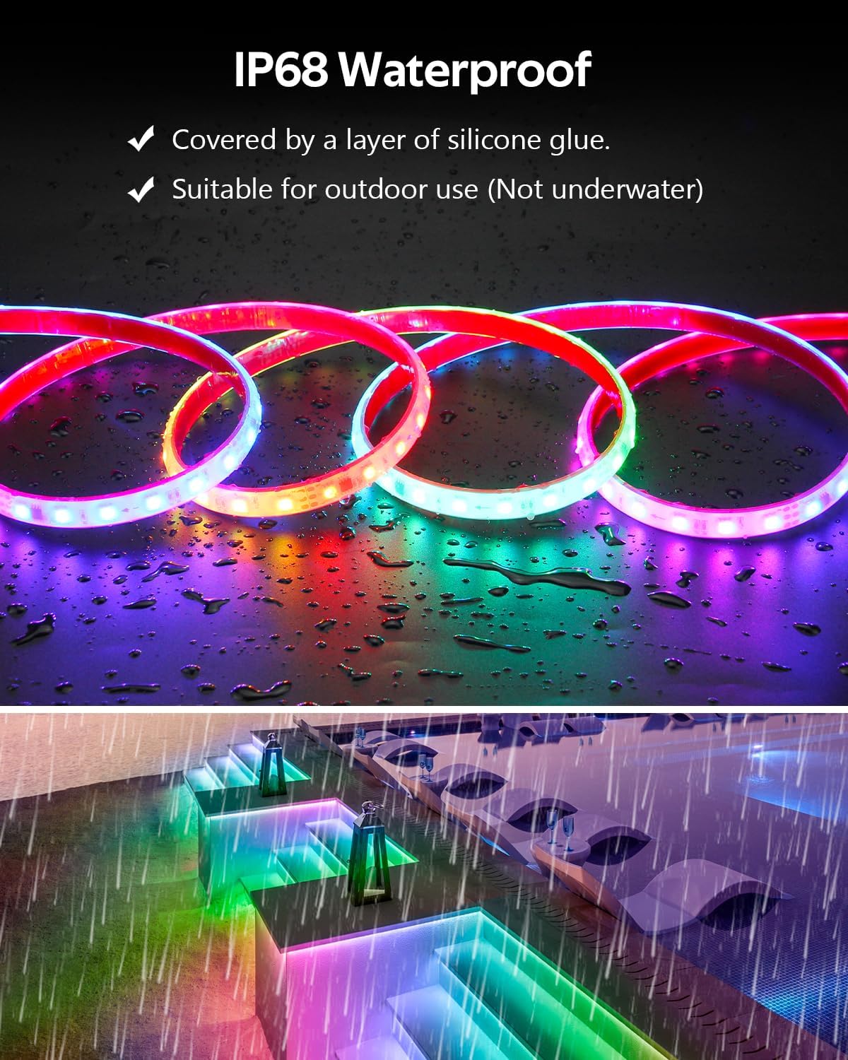 IP 68 WATERPROOF: The outdoor rope light is covered with clear thick PVC round tube, providing 360° full lighting, durable and heat resistant. It has IP68 waterproof rating, suitable for indoor and outdoor decoration. (Note: the plug part is not waterproof). Also used as streamlined strip light, LED indoor decorative light, room strip light, wardrobe light, bedroom string light.